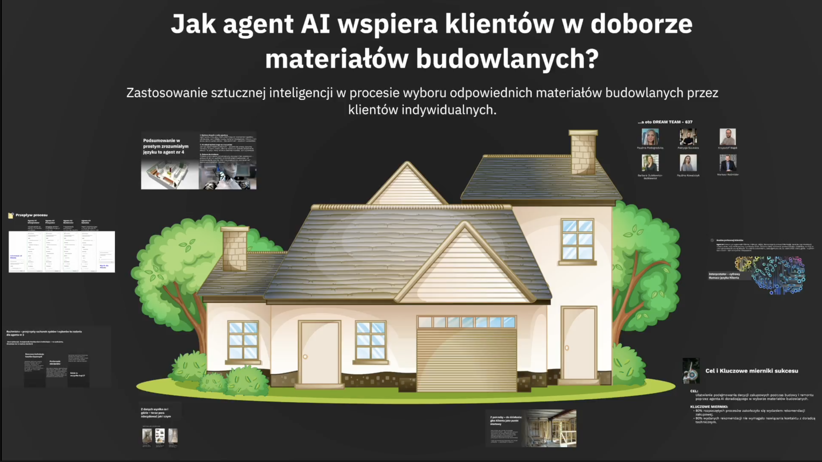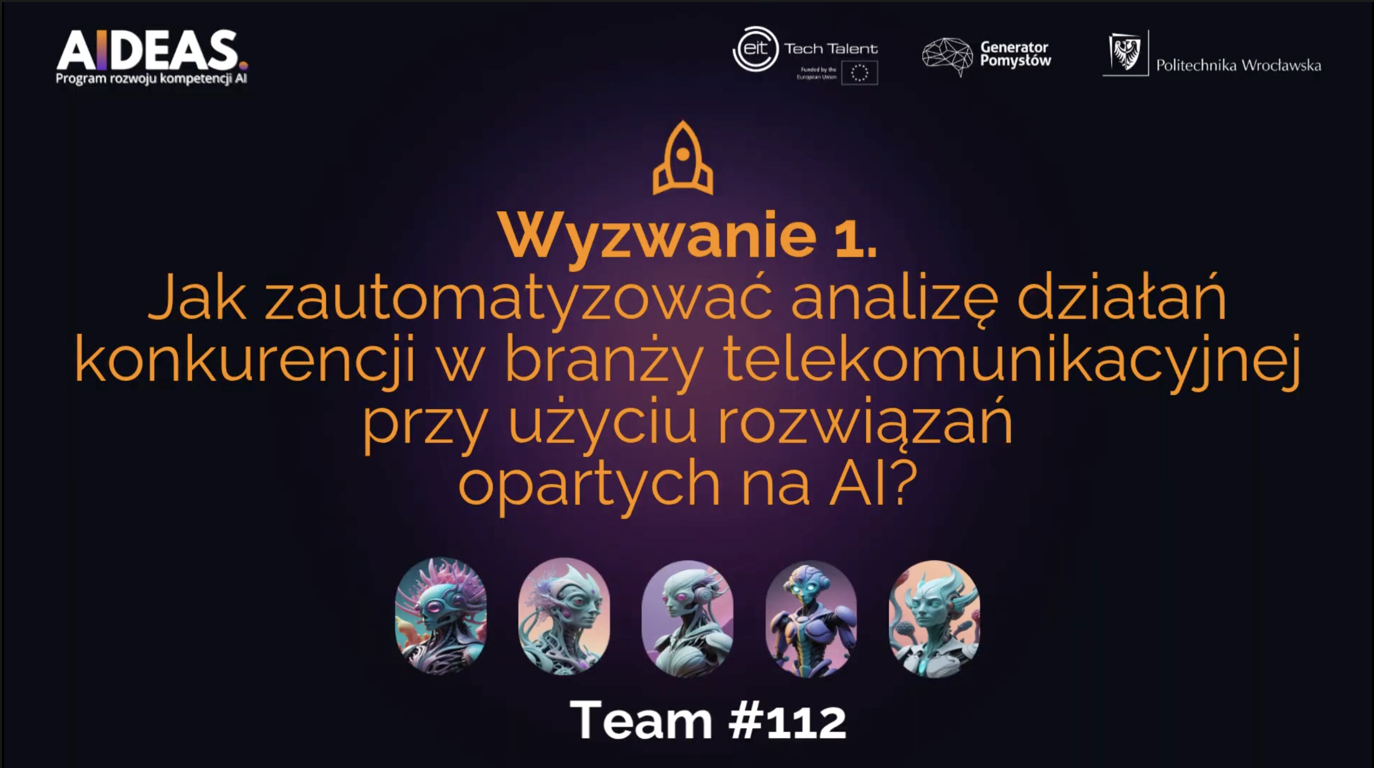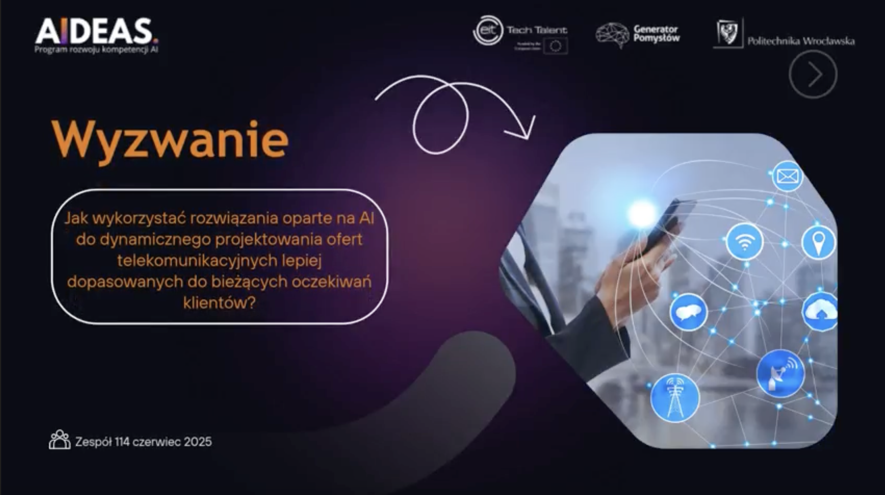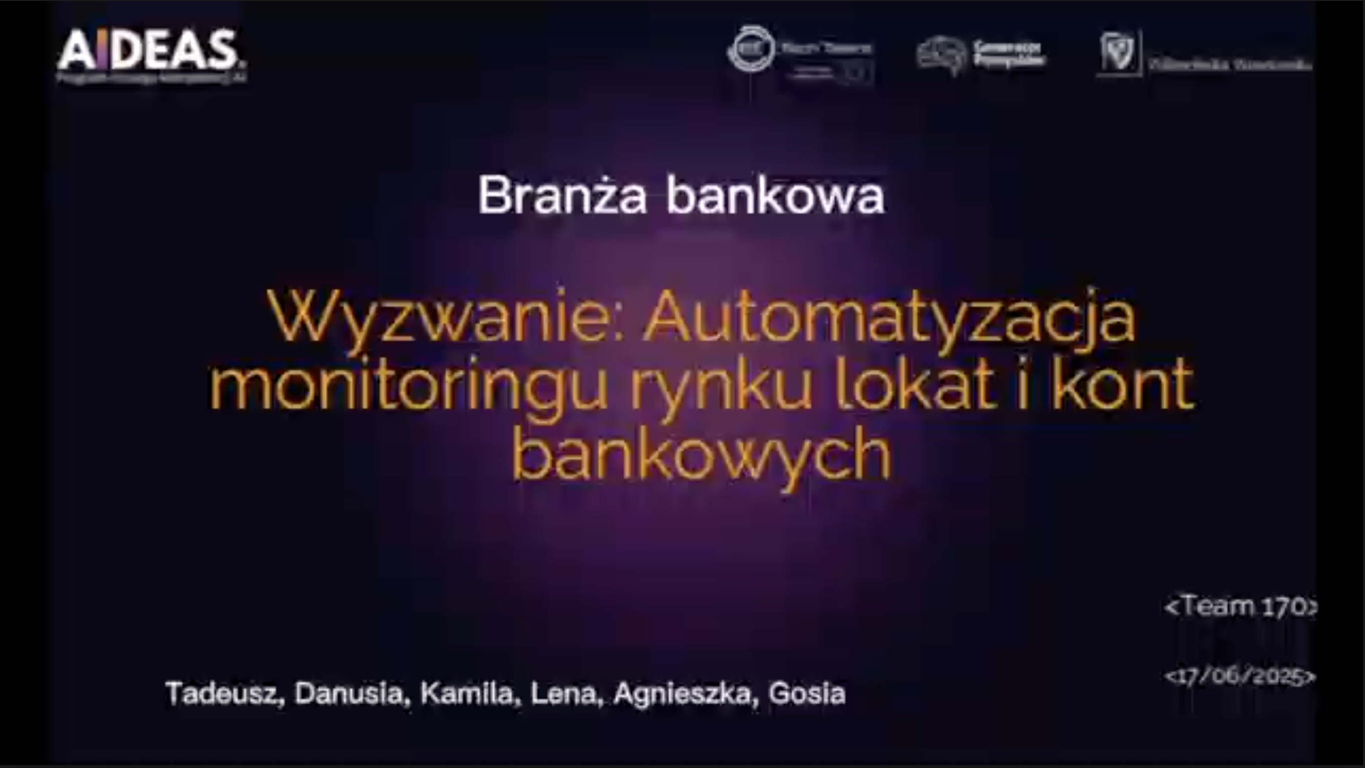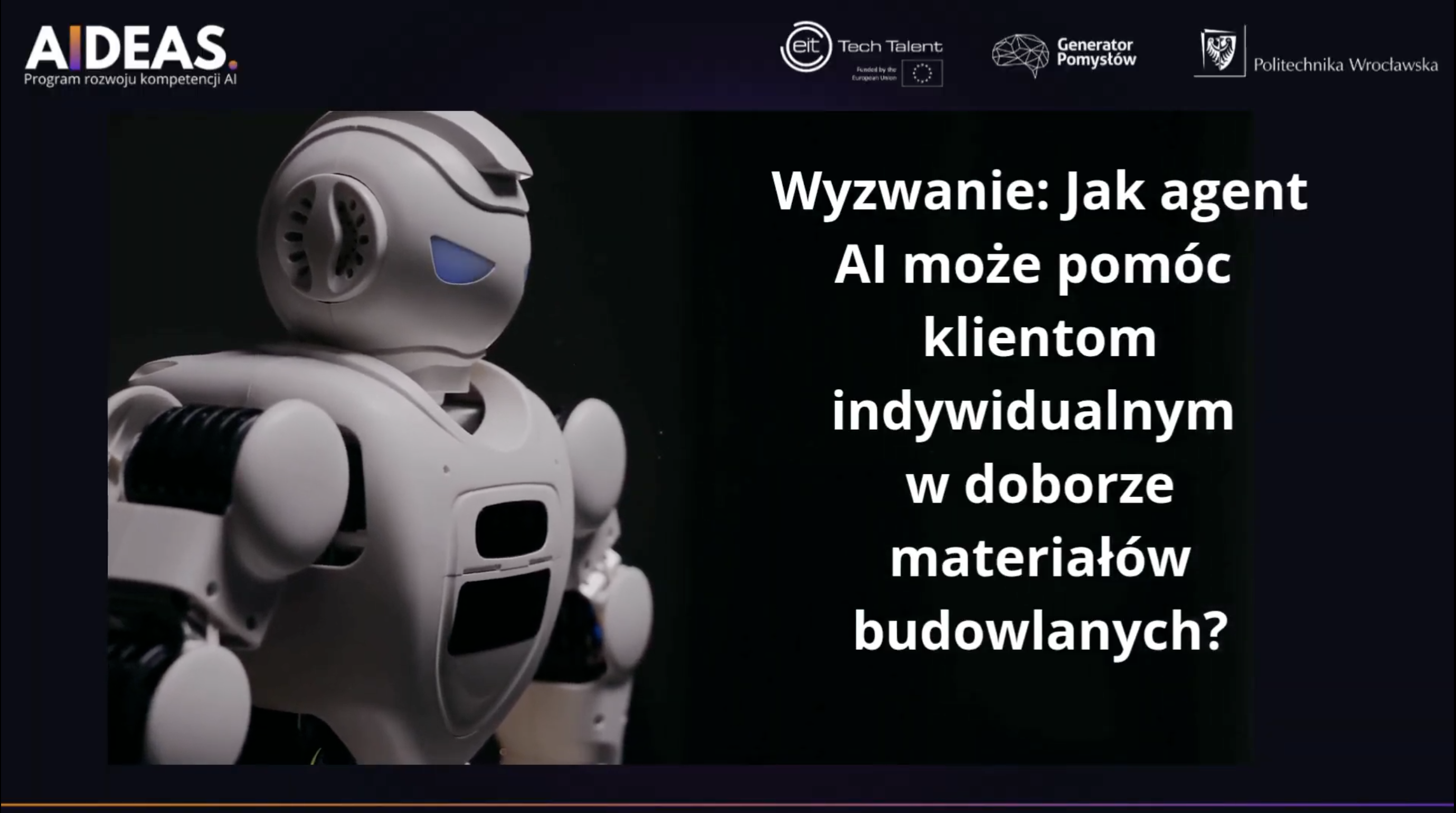 Każdy zespół to inna historia, inne wyzwania i inny pomysł na wykorzystanie AI w biznesie. Znajdziecie tutaj przygotowane rozwiązania zespołów projektowych pokazujące efekty ich pracy — od koncepcji, przez realizację, aż po finalne rezultaty.