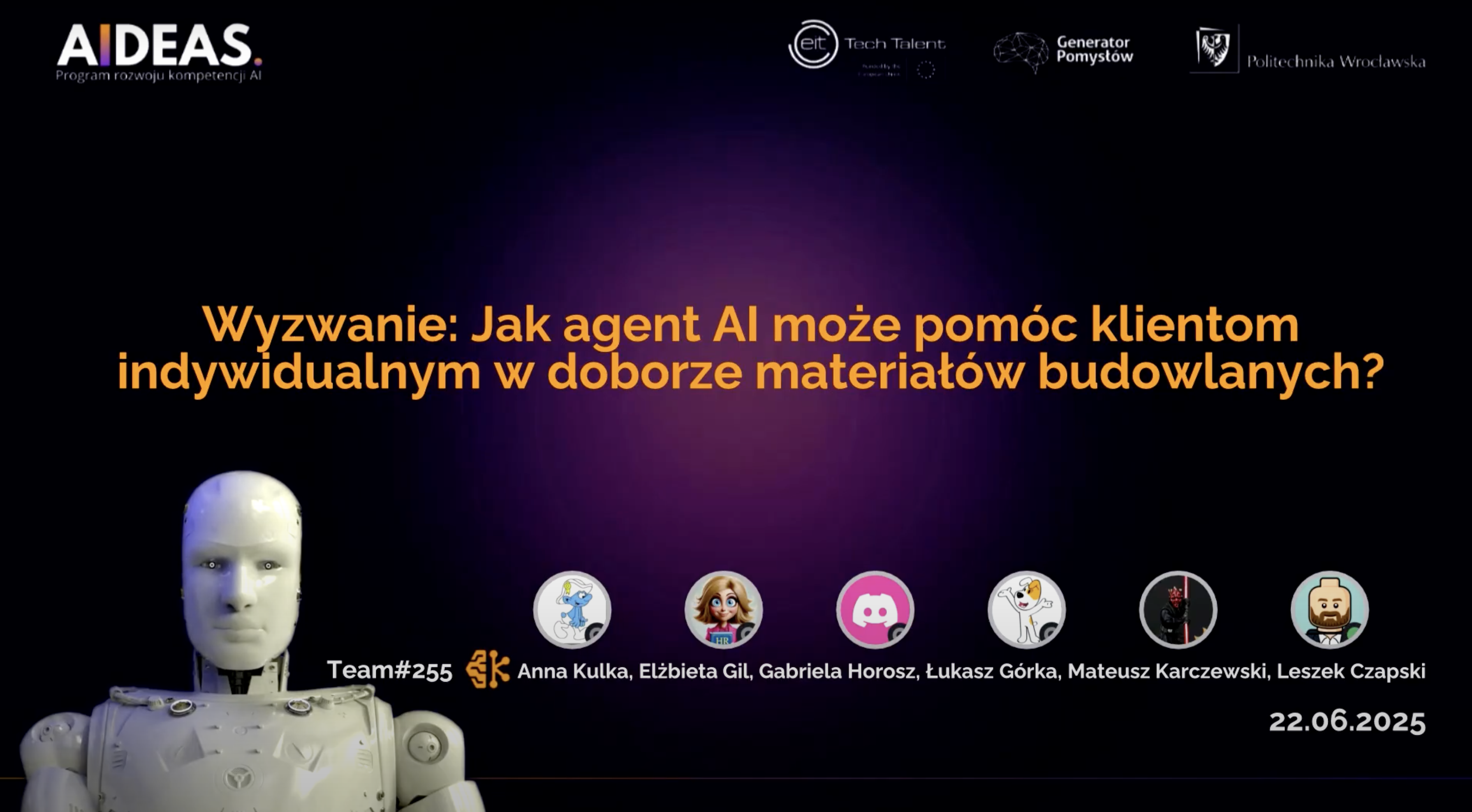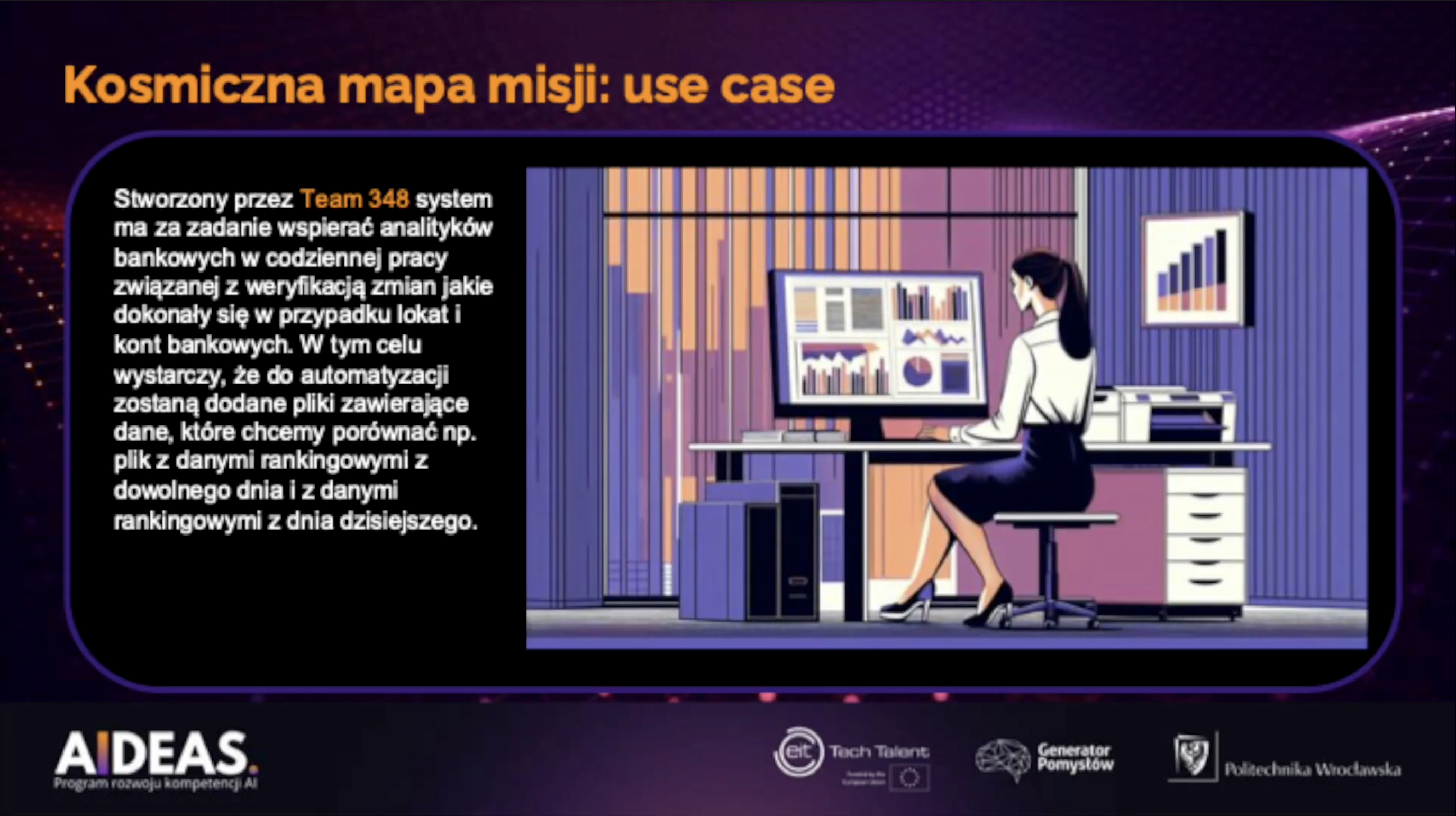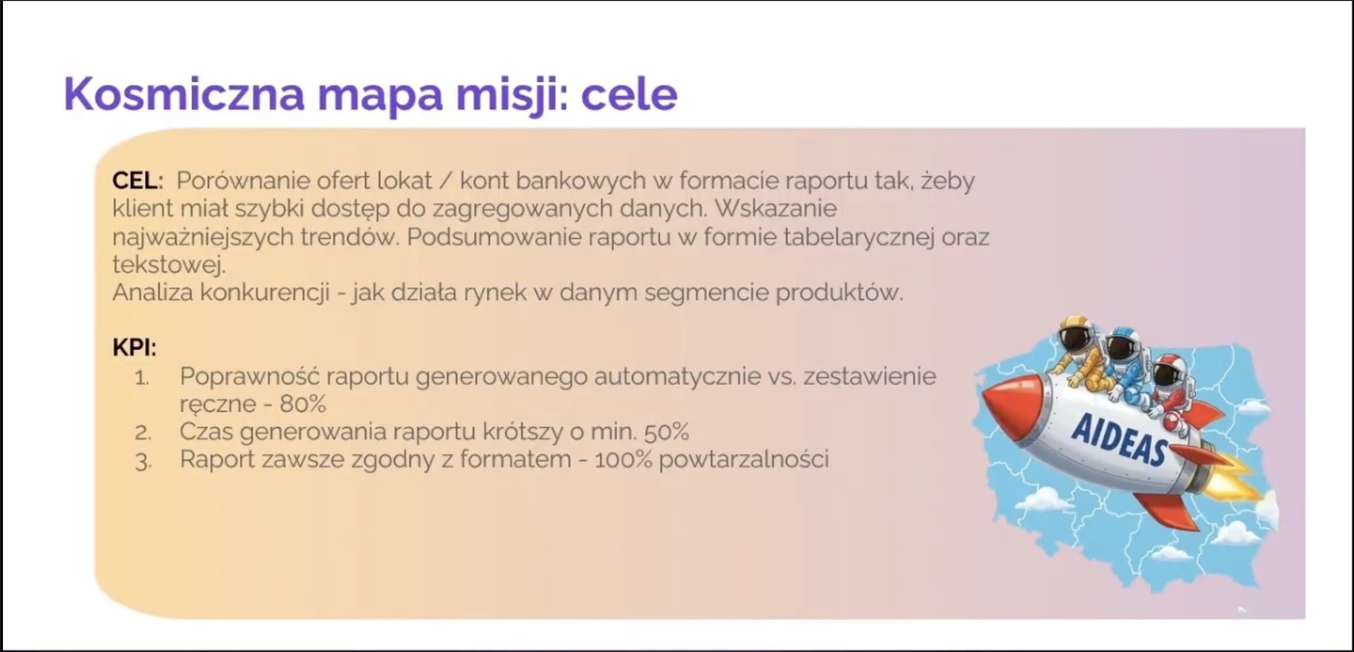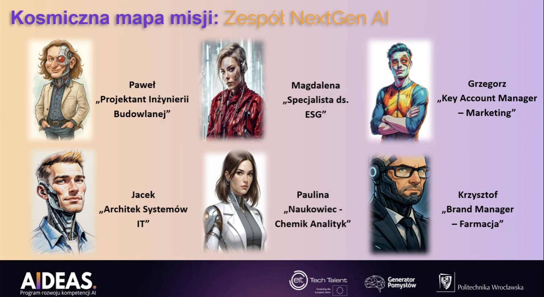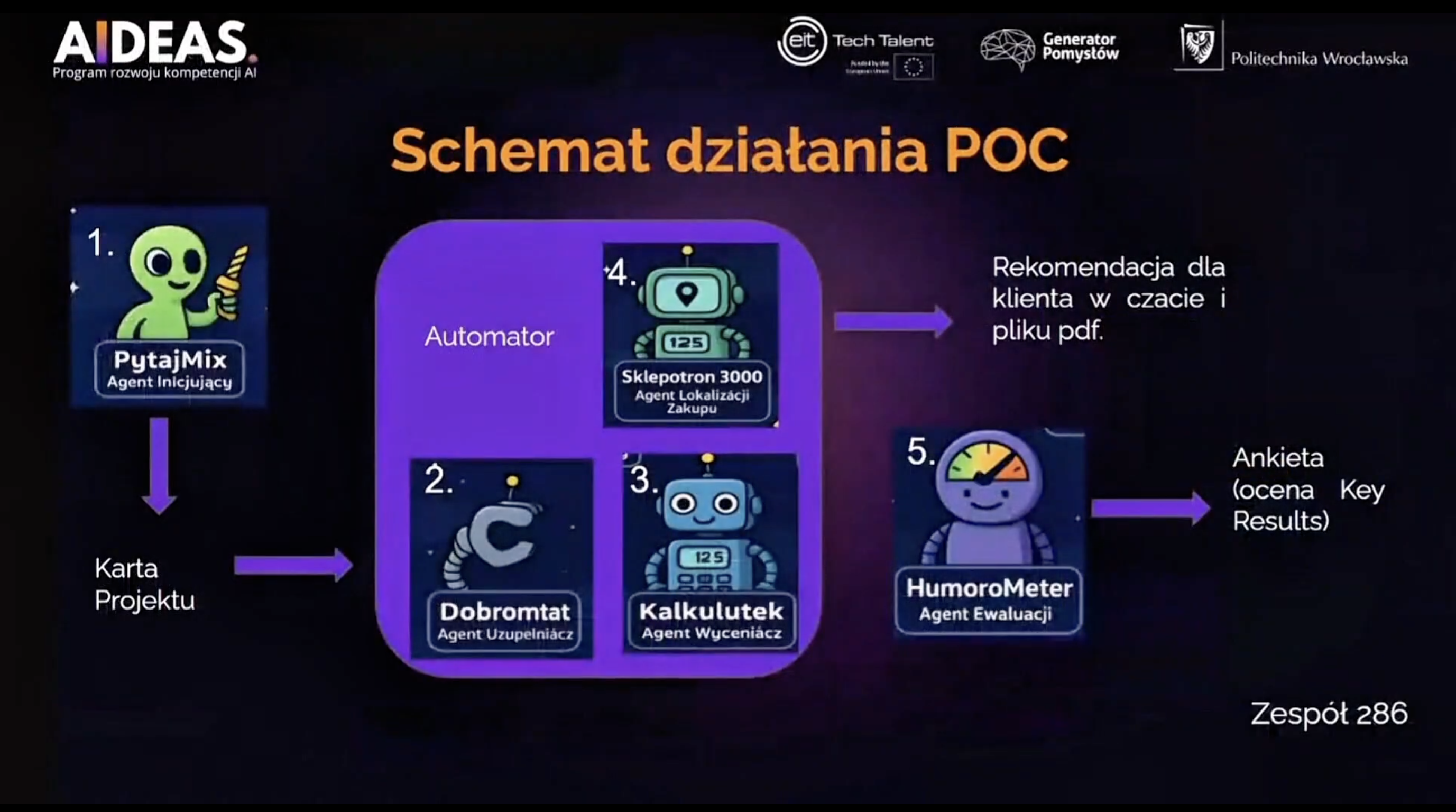 Każdy zespół to inna historia, inne wyzwania i inny pomysł na wykorzystanie AI w biznesie. Znajdziecie tutaj przygotowane rozwiązania zespołów projektowych pokazujące efekty ich pracy — od koncepcji, przez realizację, aż po finalne rezultaty.