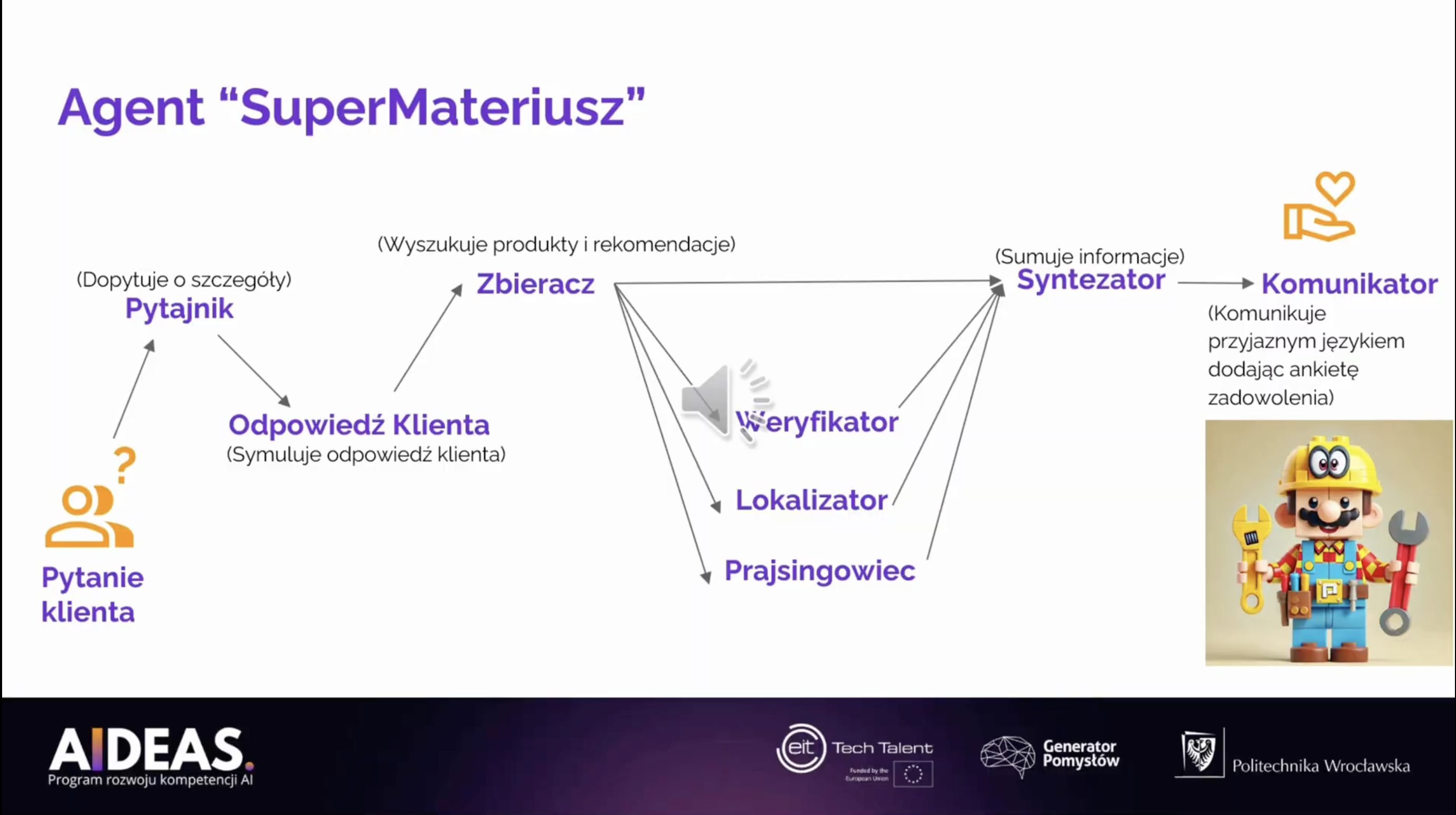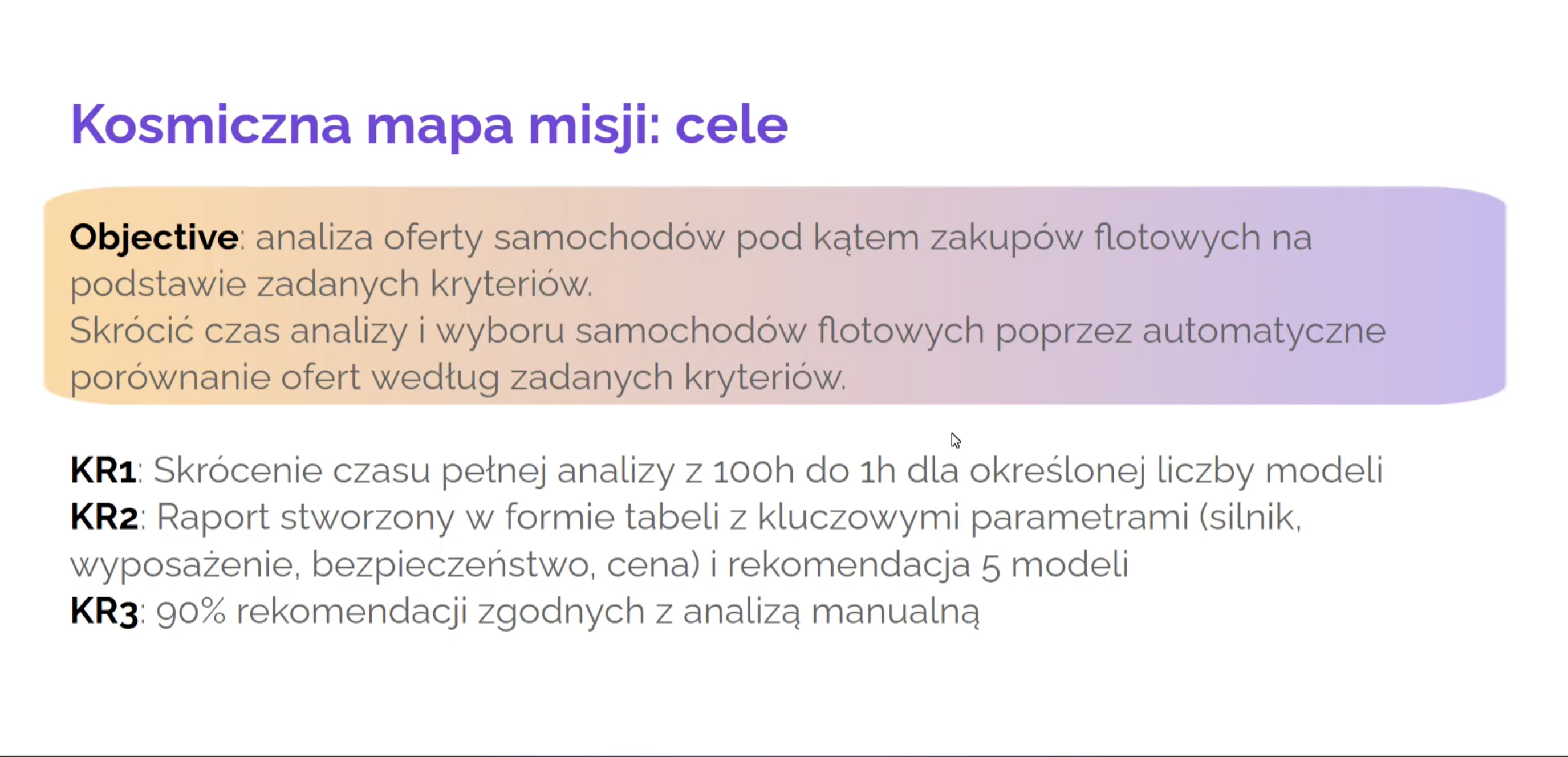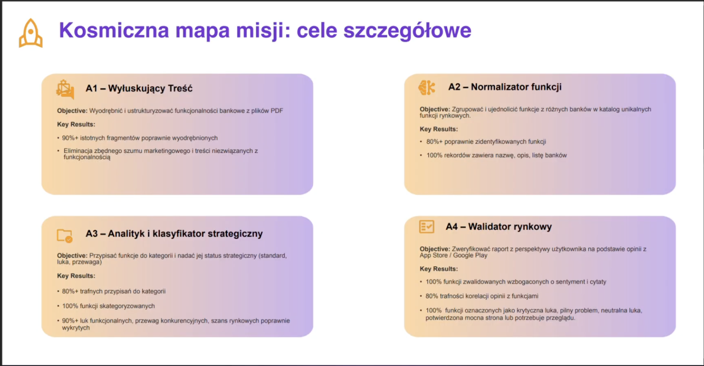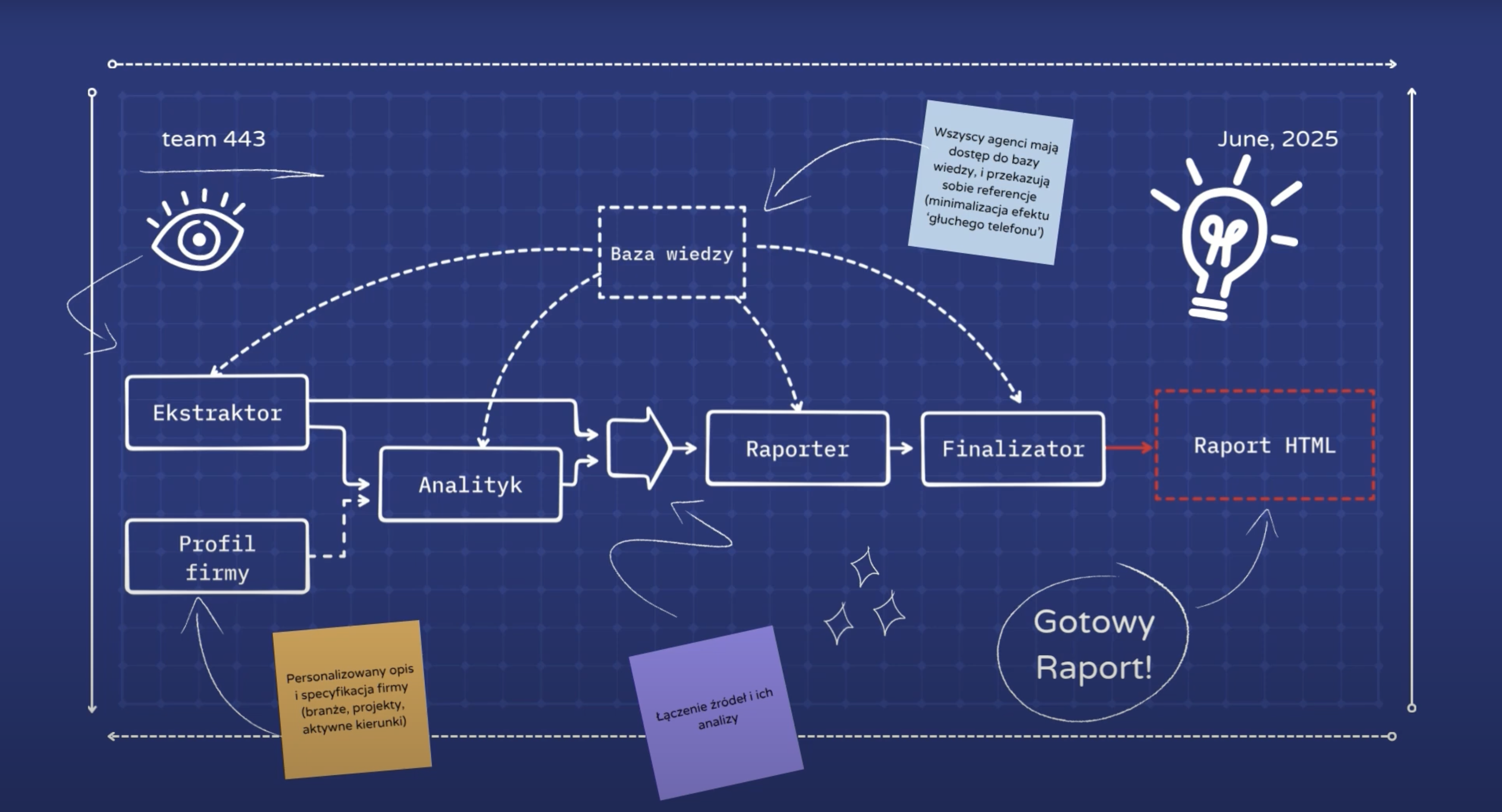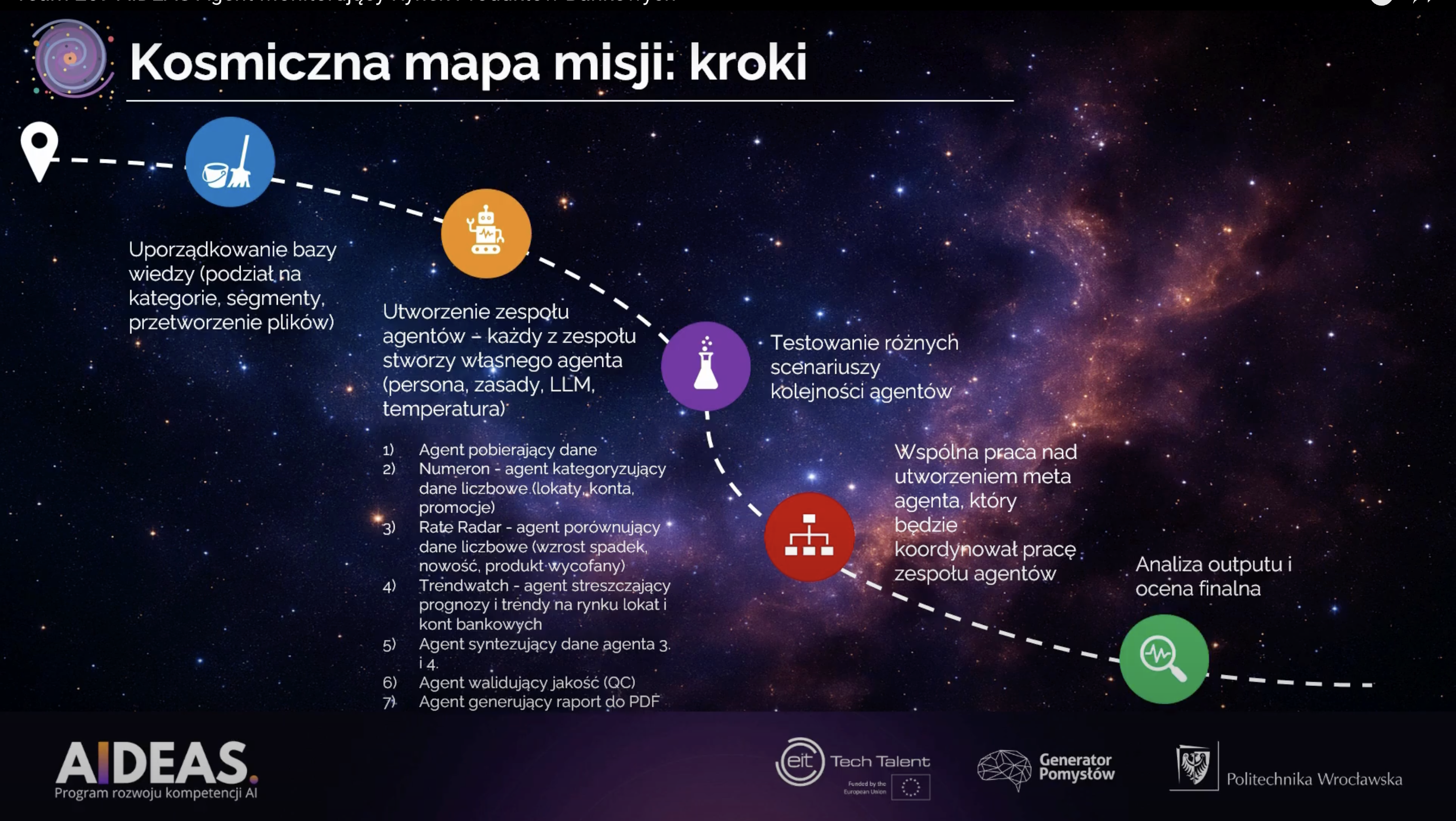 Każdy zespół to inna historia, inne wyzwania i inny pomysł na wykorzystanie AI w biznesie. Znajdziecie tutaj przygotowane rozwiązania zespołów projektowych pokazujące efekty ich pracy — od koncepcji, przez realizację, aż po finalne rezultaty.