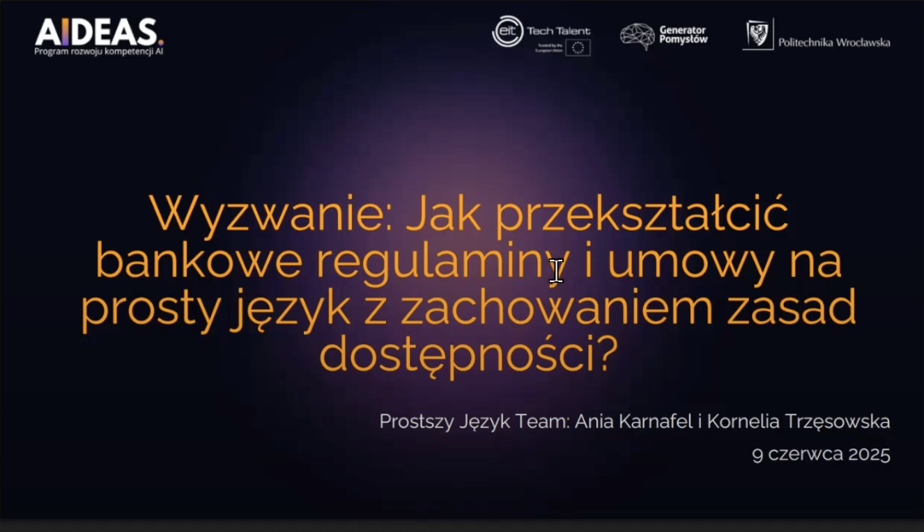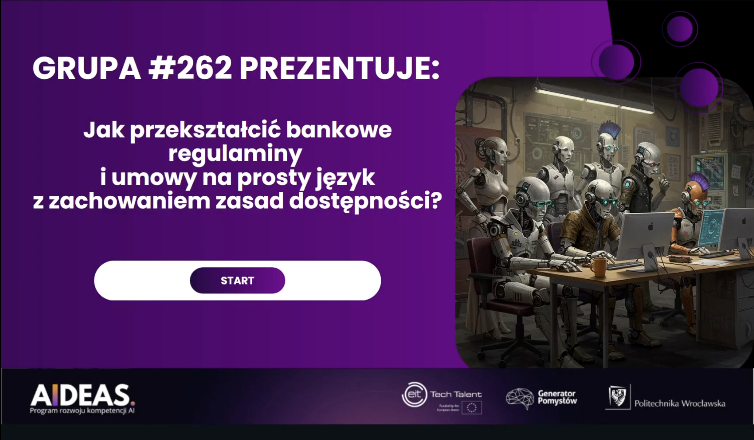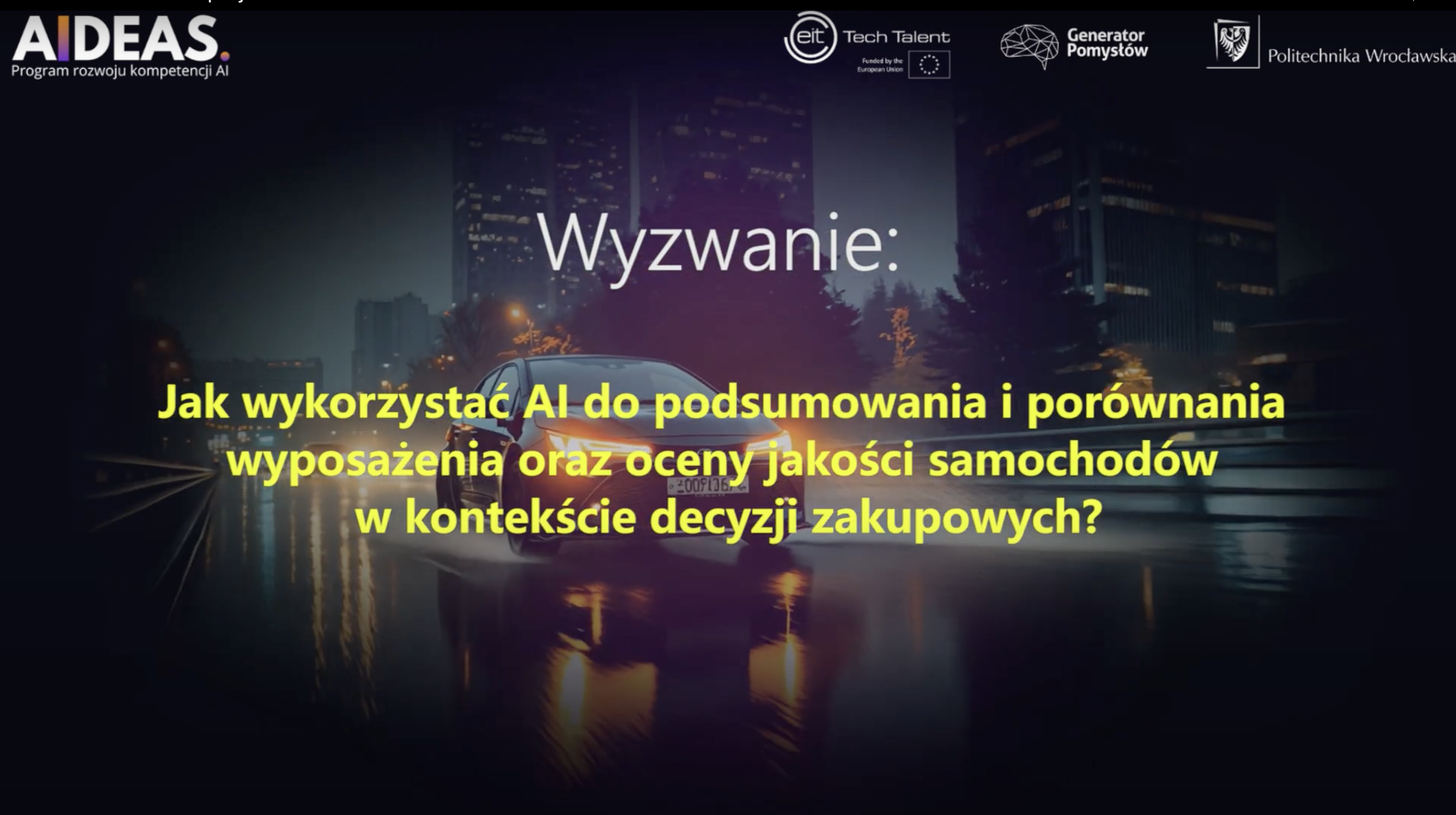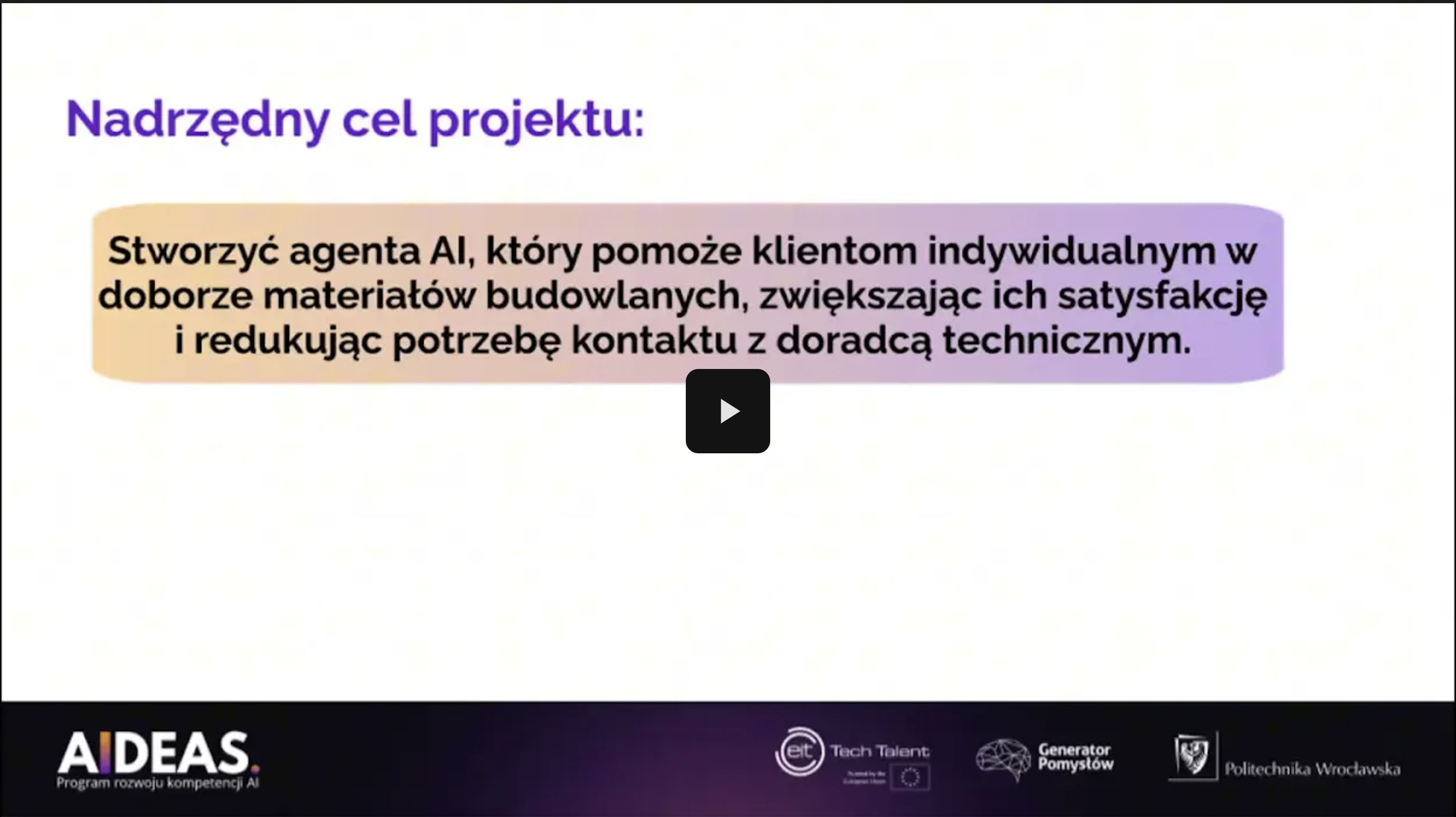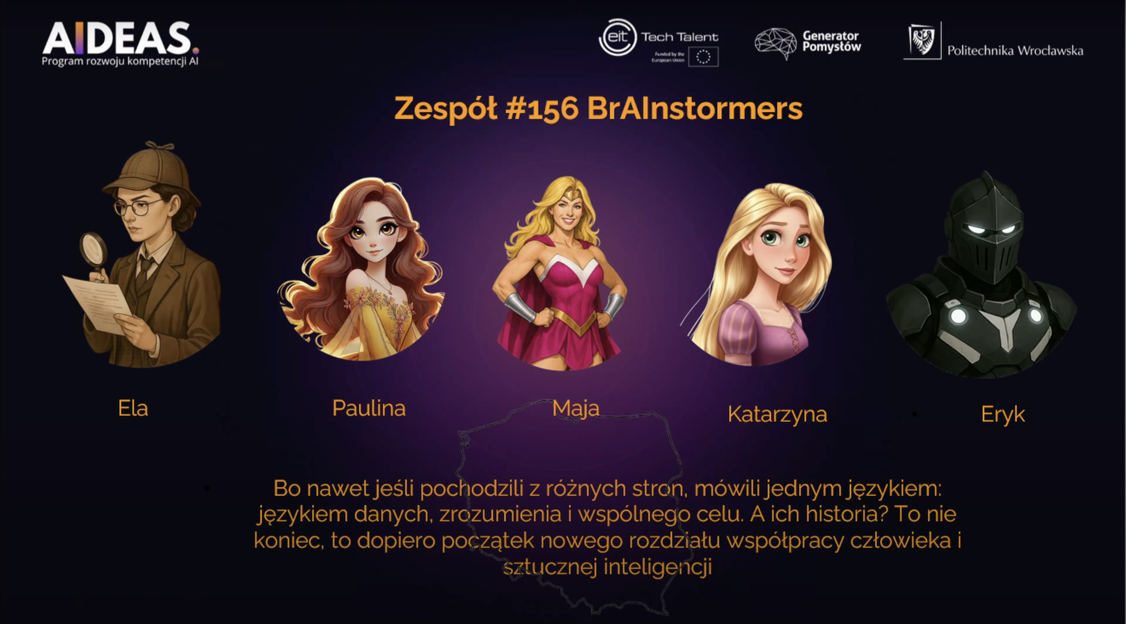 Zakładka "Wasze projekty" to miejsce, w którym prezentujemy wyjątkowe realizacje zespołów projektowych AIDEAS z drugiej kohorty programu. To właśnie tutaj możecie zobaczyć, jak uczestnicy przekładają swoją wiedzę i umiejętności w zakresie sztucznej inteligencji na praktyczne działania i innowacyjne rozwiązania.