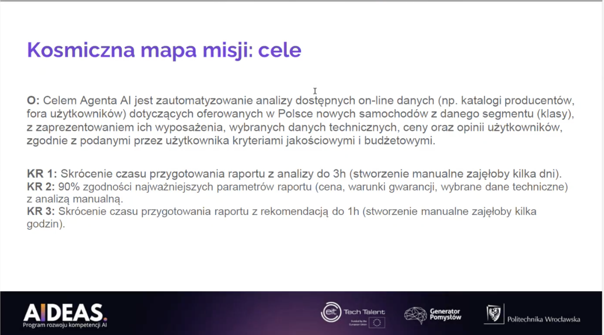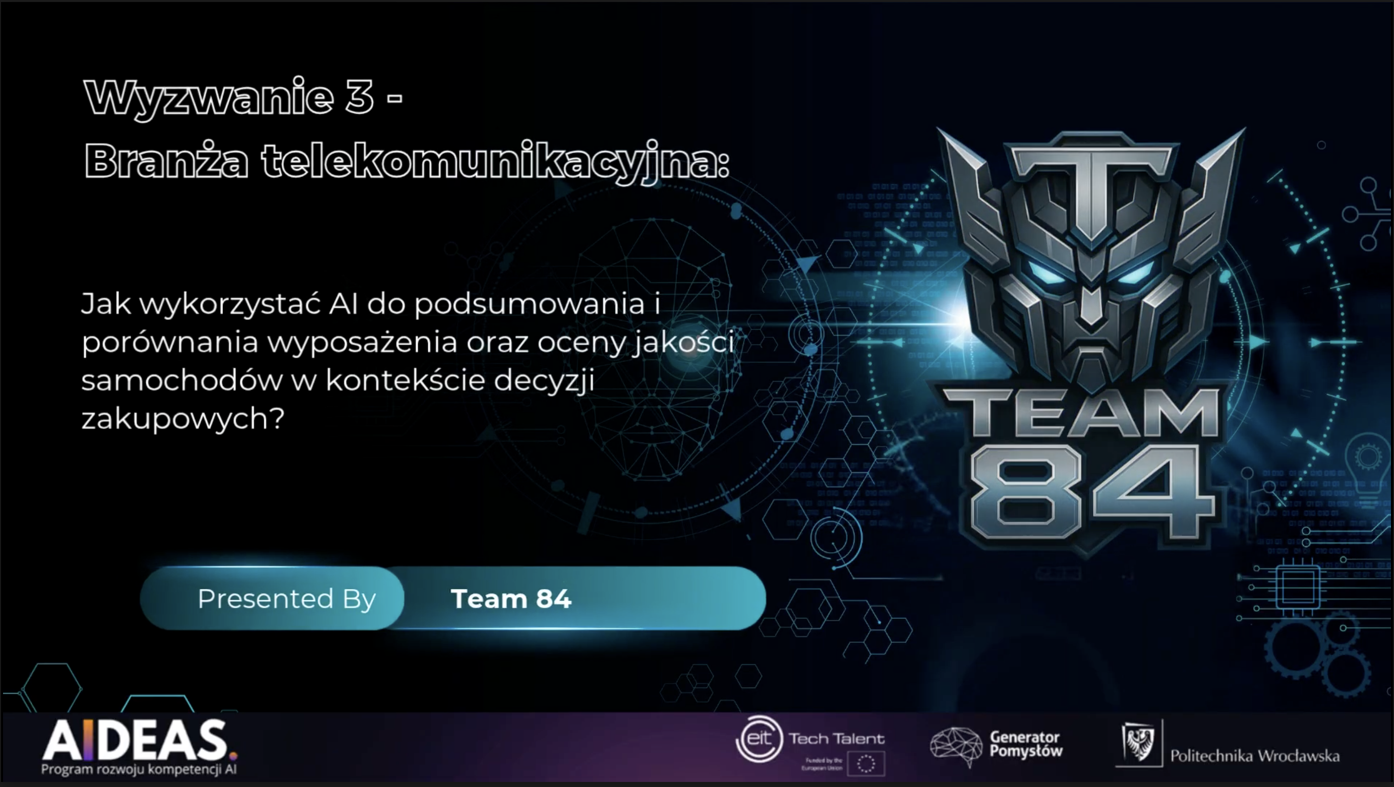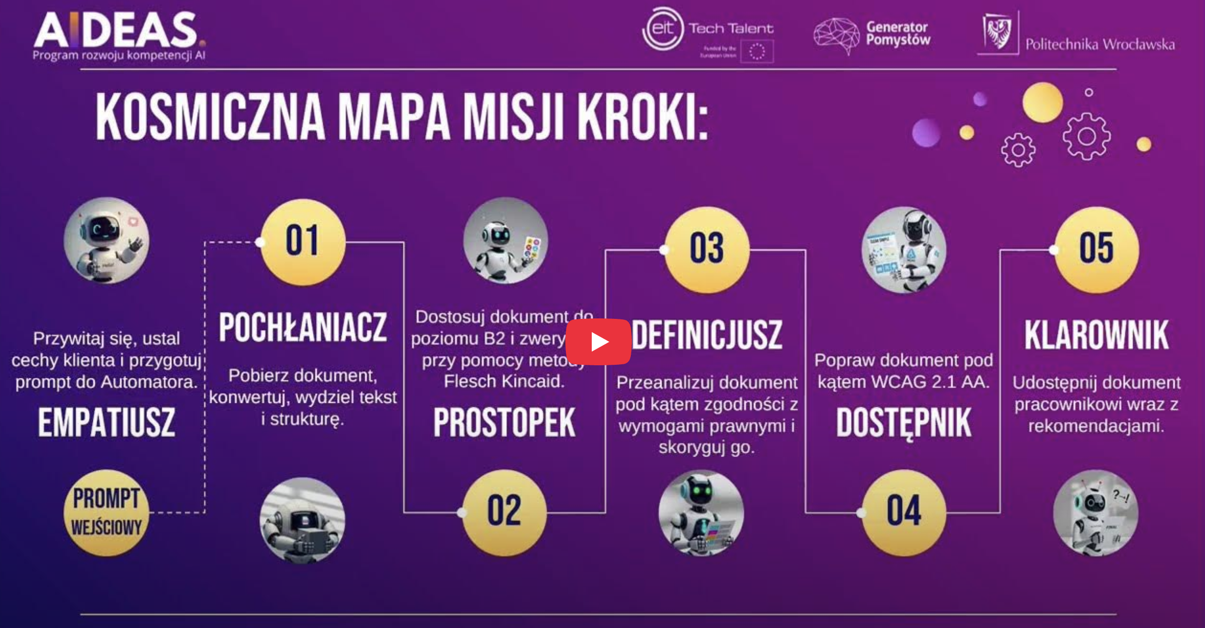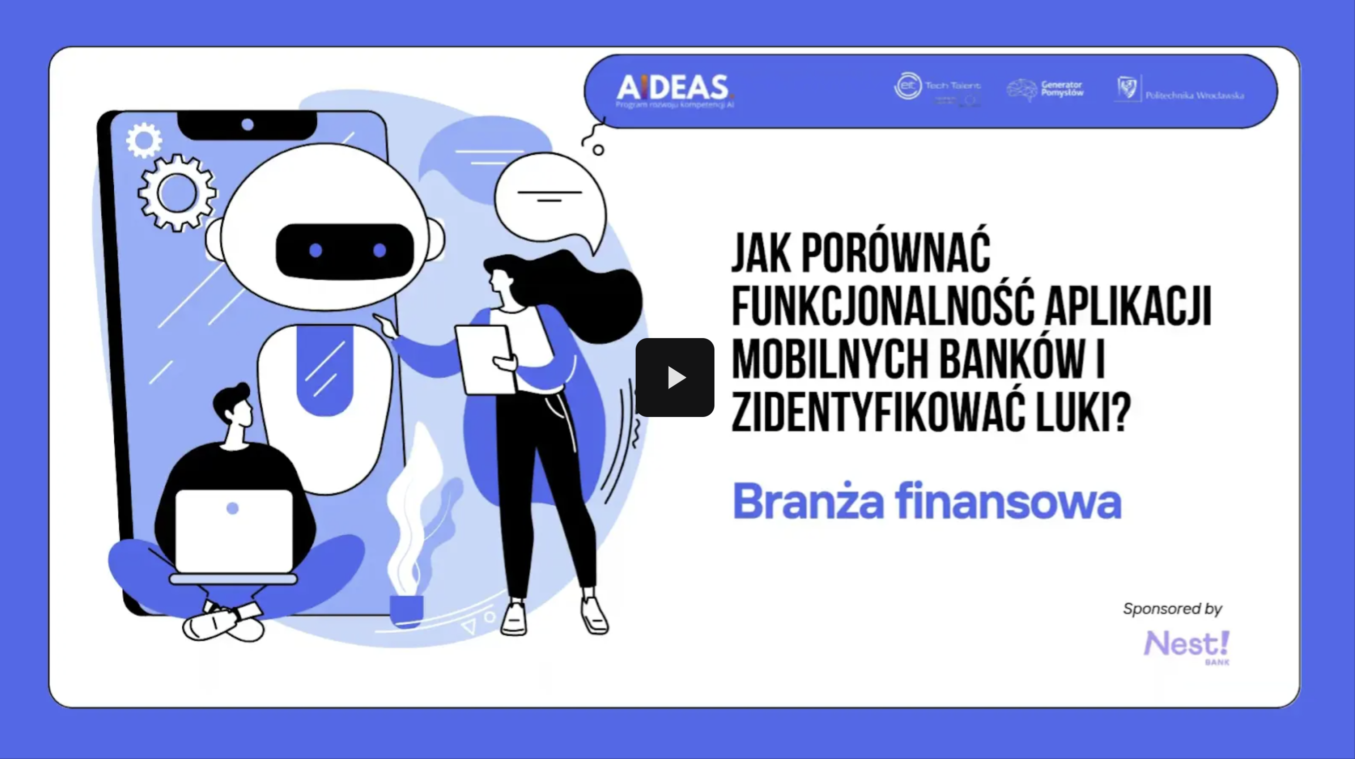 Zakładka "Wasze projekty" to miejsce, w którym prezentujemy wyjątkowe realizacje zespołów projektowych AIDEAS z drugiej kohorty programu. To właśnie tutaj możecie zobaczyć, jak uczestnicy przekładają swoją wiedzę i umiejętności w zakresie sztucznej inteligencji na praktyczne działania i innowacyjne rozwiązania.